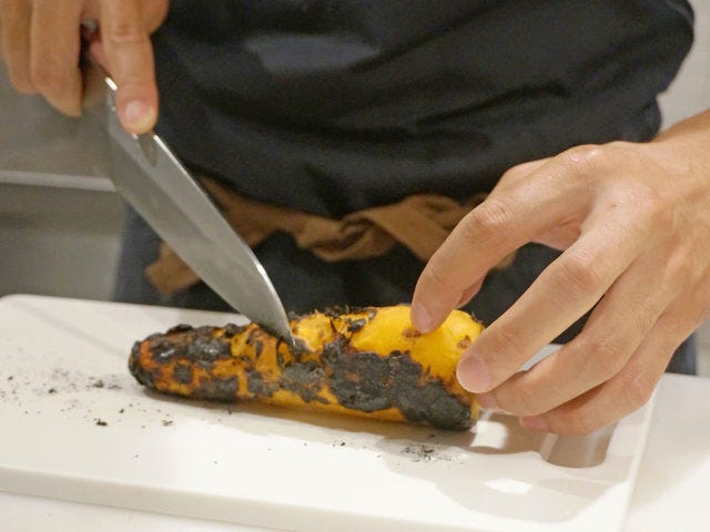 もうひとつの付け合わせは、黄色人参をホイルに包み、炭の中で焼いたもの。真っ黒に焦げた部分をこそげ落とすと、鮮やかな黄色があらわれる。イモのようにホクホクで、調味料がいらないほど豊かな甘みに驚く。