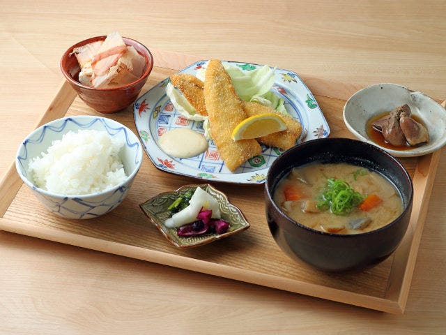 「あじフライ定食」(写真上)には刺身用のアジを使用しているので、一般的なアジフライの形ではなく棒状。骨はもちろんヒレも落として食べやすくして、細かくふるったパン粉をつけて揚げている。