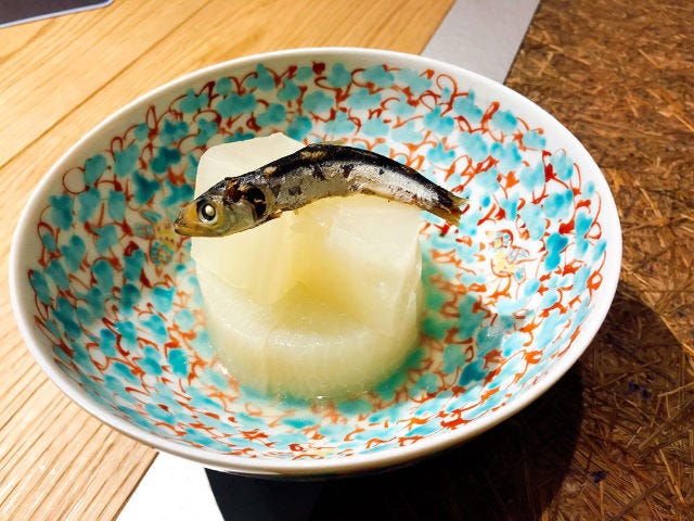 その意志を強く実感できるのが、「雑魚も食べられる大根の炊いたん」(写真上)。わずかな塩、ほんの少々のみりんと日本酒のみで調味し、煮干しといっしょに炊いただけで、「あるかなきか」と言いたいほどの淡い味付けだ。