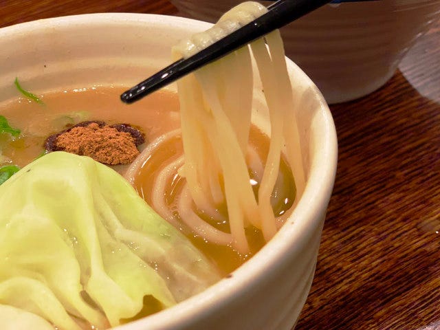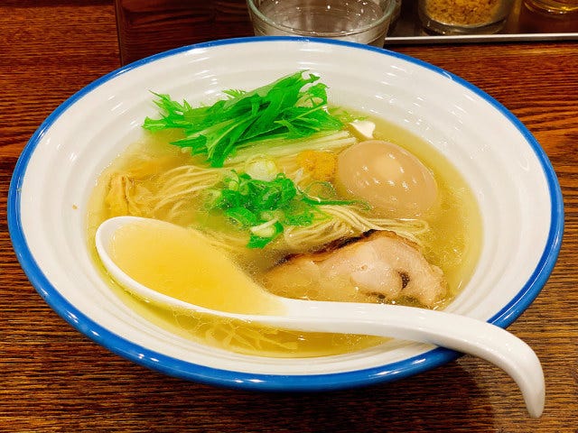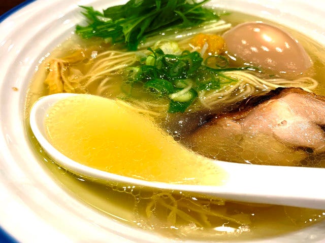 スープは雑味が一切なく、淡麗にしてふくよかな味わい。いくつものうまみの要素が重なりながら、まろやかな塩味と合わさって混然一体となっている。西洋料理の上品なスープや毎日飲める味噌汁のように、あっさりしていながら奥深い味わいだ。
