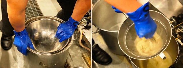 それをざるに入れ、ボウルを重ねて、全身の力で押してこす。マメはこの時、ボウルのふちに全体重をかけるためにできたもの。