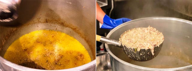 鶏ガラの骨を細かく砕き、丸鶏、モミジとともに煮込んだもの(写真上・左)から、柔らかくなって肉と骨が一体化し、そぼろ状になったもの(同・右)をすくい取る。