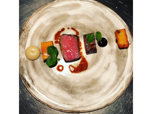 写真上・右から3つ目は、茄子の味噌田楽をミニサイズに仕上げたもの。他には黒ガーリック、千切りにしたポテトを牛脂と合わせて固めたもので構成されている。