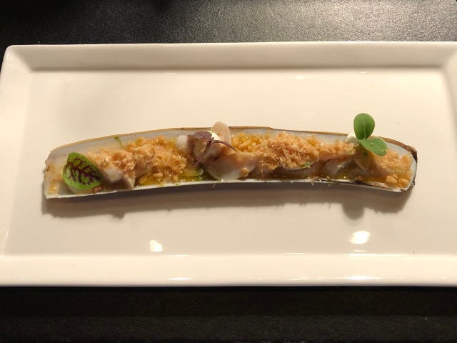 「レーザー・クラム(マテガイ)」(写真上)は見た目に楽しいうえに、ライムヨーグルトのソースと、上にかかっているピーナッツとスルンデン(ココナッツフレーク)のトッピングが効いている。ちなみに、シェフのマルコ氏は食材のシーズンにこだわっていて、例えば冬にトマトやイチゴは出さないと話していた。
