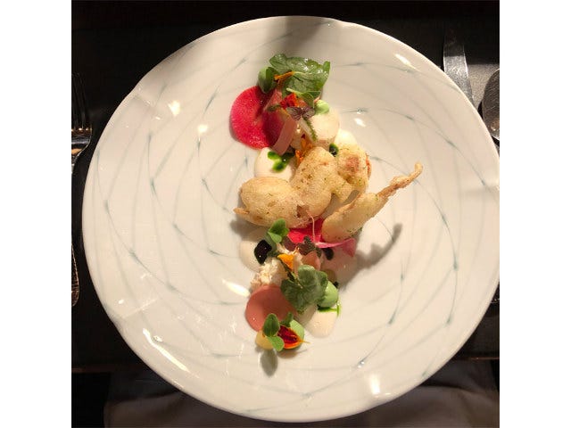 「クラブ(蟹)」(写真上)は2種類の蟹が使われているのだが、殻までまるごと食べられるソフトシェルクラブは天婦羅にしてある。レッドスパイダークラブ(タカアシガニの一種)は蒸して、マヨネーズ、クレームフレーシュ(サワークリームの一種)、白醤油を混ぜたソースが添えられている。2種類の蟹を味わえるうえ、見た目にカラフルできれいな一品だ。