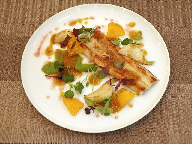 魚料理は「穴子の鉄板焼き サフランと生姜 柿」(写真上)。穴子は生姜と酒で蒸してから鉄板で焼くことで、中はふんわり、外はカリっと香ばしく仕上げられている。添えられているのは、アマレットとシロップに漬け込んだ柿と、生姜とオマールのだしでコクを出した白ワインソース。