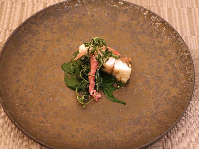 コースの中の一品「三重産 真ハタのソテー 春菊のソース」(写真上)は、アーティスティックなビジュアルも楽しめるメニュー。真ハタには、アラカルトではバルサミコ酢ベースのソースを合わせているが、コースでは和の食材、春菊の香りと苦みを生かしたソースと共にいただく。