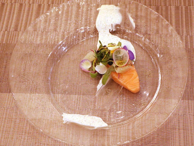 前菜は「タスマニア産サーモン 低温調理 黒胡椒とサワークリーム」(写真上)。35℃という低温でサーモンを調理することで、生では味わえないしっとりとした食感が生まれる。