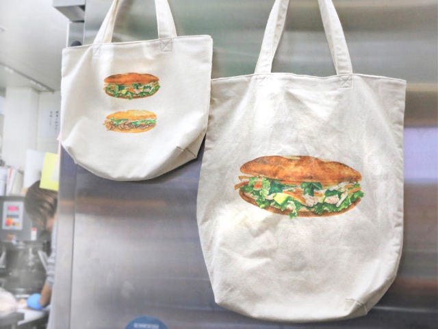 Beacon(ビーコン:信号を使って位置や情報を発信する端末やその通信方法)も早々に取り入れて、ポイントが貯まるとトッピングが無料になるサービスもはじめた。さらに、ポイントをたくさん貯めると、バインミーのイラストが描かれたトートバッグ(写真上)とも交換可能。かわいいバッグが手に入る日を心待ちにしてバインミーを楽しむのもオツなものだ。
