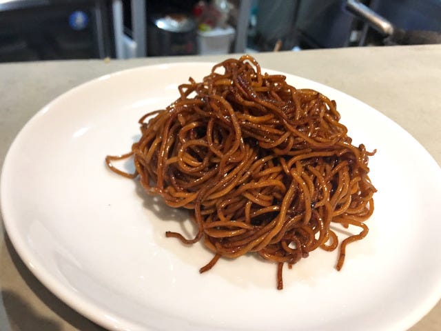 カウンター全員が、1人ひと皿のリピーターになる「香港風素焼きそば」の破壊力も半端ない。茹で麺用の中華麺を丁寧に蒸し上げ、いったん天日に干し、中華鍋の中で徹底的に炒り付け、オイスターソースでまとめ上げる。