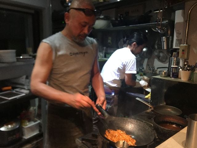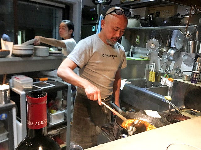 でも、いちばんご機嫌なのは、その真ん中で踊るように鍋を振るシェフ、宮崎小弥太(こやた)さんかもしれない。