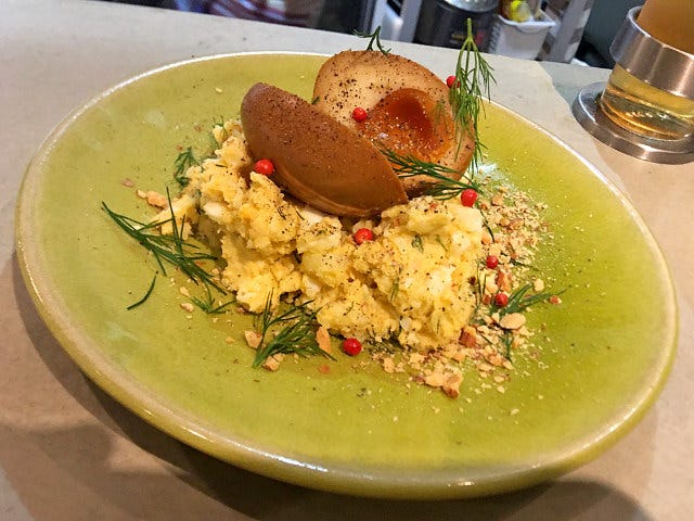 一面が卵の色に染まる「卵だらけのポテトサラダ」には、さらに絶妙なコンディションの煮玉子が乗る。