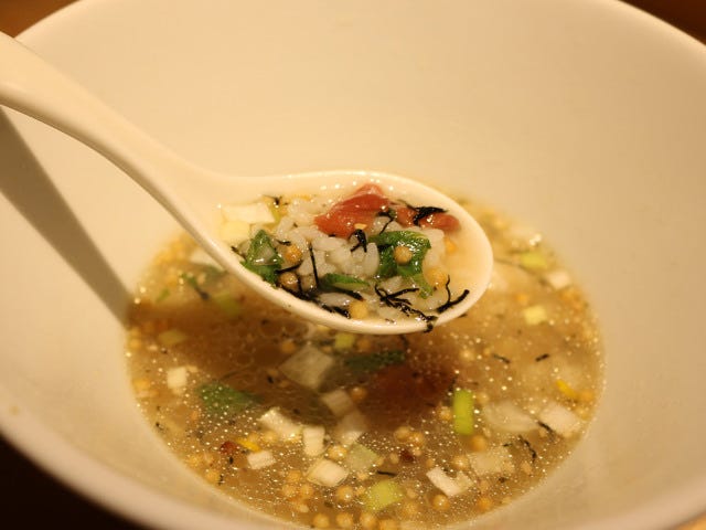 追加で、「お茶漬けセット(残したスープで、半ライスと梅干し等)」(写真上)を注文。「お茶漬け」、いや、「スープ漬け」にして締めるのが、『鶏そば 山もと』の定番なのだ。