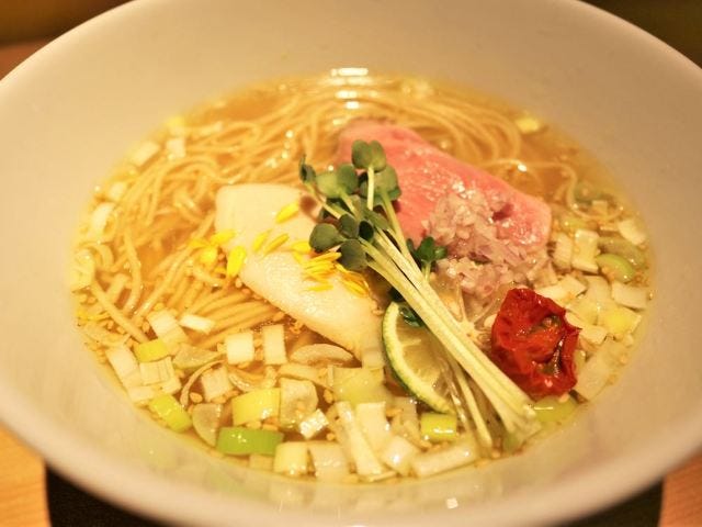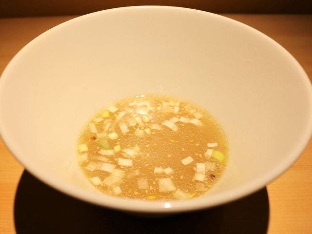 まずはスープをひと口。鶏と和だし、魚介のエキスが見事に一体となったシンプルながらも奥深い風味に、思わず前のめりになる。