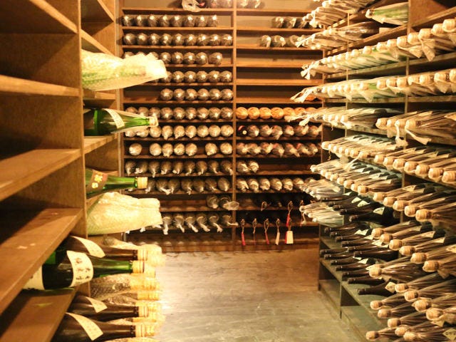 「鶏そば」で満腹になるが、夜に再来店したいと思う人、続出だろう。それは、この巨大熟成酒庫(写真下)を横目にラーメンを啜るのだから、当然のこと。鶏そば同様、熟成酒の熱燗と焼鳥の世界にも注目したい。