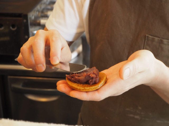 イートインできるのも同店ならではの楽しみだ。カウンター席のすぐ目の前が厨房になるので、大塚さんが生地にあんこをはさむ作業を眺めたり、大塚さんとおしゃべりを楽しんだりと、甘党にとっては至福の時間が過ごせる。