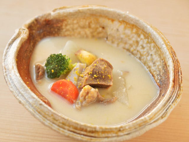 「白味噌のタンシチュー」(写真上)。運ばれてきた瞬間、ふわっと立ち上る柚子の香りが食欲をくすぐる逸品だ。昆布だしにタンからとったスープを合わせ、白味噌を溶いたシチューは、優しくもコク深い味わい。じんわりと染みわたり、寒い季節に身体を芯から温めてくれそうだ。