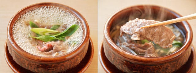 続いて「牛とキノコの小鍋仕立て」(写真上)。エノキ、シメジ、マイタケといったキノコと、京都牛のうまみがギュッと詰まったスープは、さっぱりしていてコクがある。肉質のやわらかい京都牛は、噛めば噛むほど肉のうまみが口の中に広がり、とろけていく。