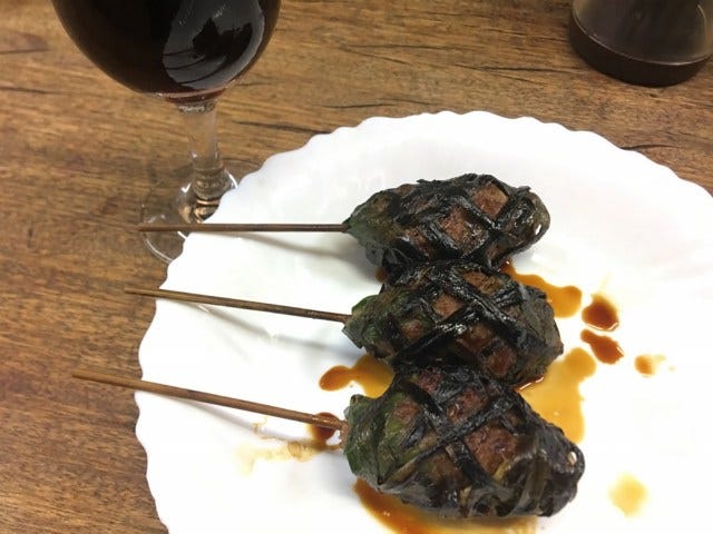 名物のまくらは、豚挽き肉を1本ずつ丁寧にニラで巻き上げたオリジナルの串。ちょうどひと口で頬張れる大きさの中には、限りない滋味と先代勝子さんの優しさがぎっしり詰まっている。