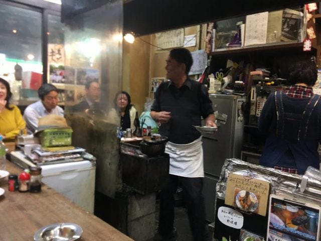 客の話にこたえながら焼き台に立つマスター、長島太一さんの周りで、常連さんたちの話が明るく弾んでいる。
