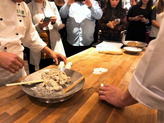 オープン初日は報道陣を招待した試食会を開催し、創業者兼シェフのMak Kwai Pui(マックワイファイ)氏とLeung Fai Keung(レンファイブン)氏が、餃子の包み方と名物の「ベイクドBBQポークバンズ」のつくり方をデモンストレーションしてみせた(写真下)。