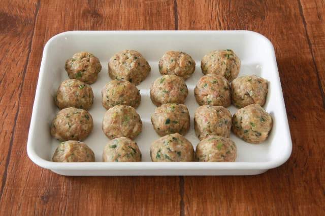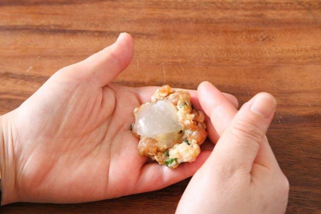 ④ ボウルに豚肉、長ネギ、生姜、ニンニク、青ネギ、Aを入れて粘りが出るまでこねたら18等分にする。②の冷やし固めたスープを18等分し、肉ダネに包んで冷凍庫におく。