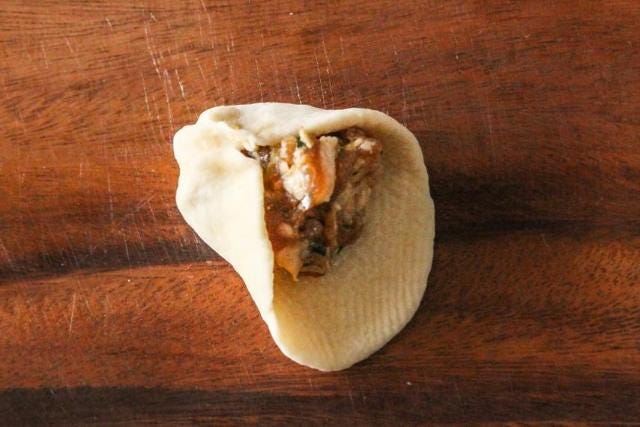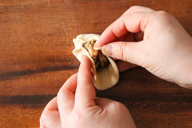 餡を包む際は、生地の中央に餡をのせ、まわりの生地を中心に向かって折りたたんでいき、指でつまんでしっかり閉じる。