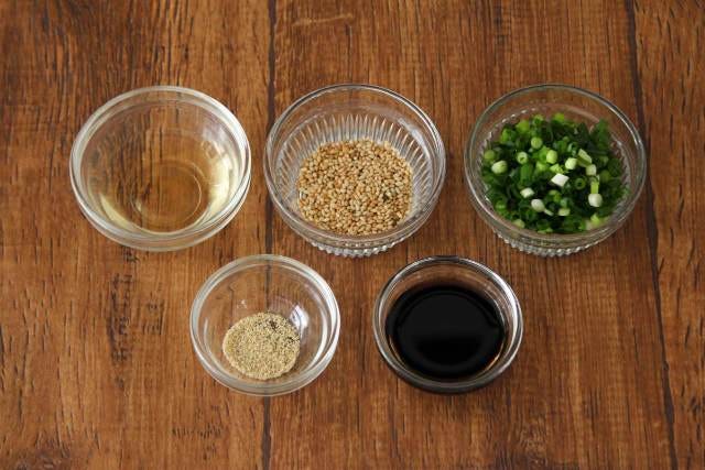 ⑩ 器に盛り、青ネギ、白ゴマを散らし、コショウをふる。食べるときにCの醤油と黒酢を混ぜて添える。
