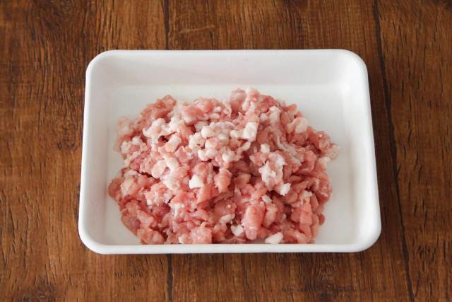 具材となる肉は、市販の挽き肉を使うと手軽だが、ブロック肉を刻んで使うと肉々しい食感の餡になる。包丁でひと口サイズ程度に切ってからみじん切りすると切りやすい。
