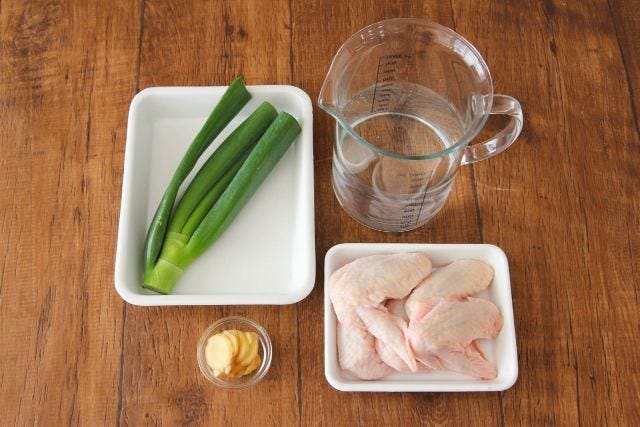 ① 鍋にスープの材料を全て入れて強火で熱し、煮立ったら弱めの中火で1時間ほど煮る。煮汁が200mlになるまで煮たら、手羽元、生姜、長ネギの青い部分を取り出す。