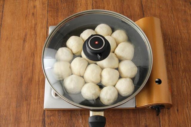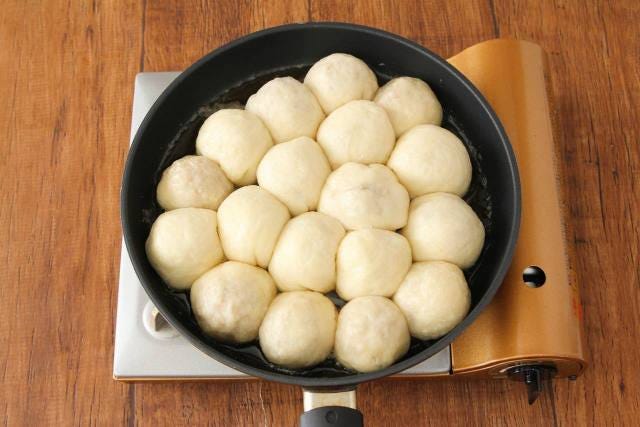 ⑨ 蓋を開け、水気が残っていたらキッチンペーパーでふきとる。ゴマ油(分量外、適量)を小籠包の高さの1/3まで注ぎ入れてきつね色になるまで強めの中火で1~2分ほど焼く。