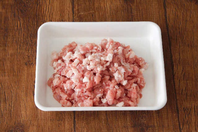 自家製挽き肉は、豚ロースと豚バラを合わせて使用する。赤身と脂身のバランスがよくなり、肉々しさとジューシーさをいいとこ取りした餡になる。