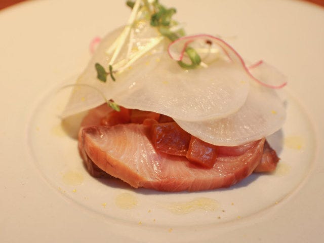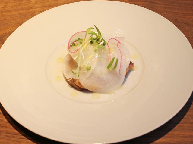 レア感を残して絶妙にスモークされたブリは、この時期ならではのトロっとした甘さがあり、スモーキーな余韻を残す。大根スライスは、シャキシャキ感を失わないように湯通ししてマリネ液に漬け込み、しっかりゆずの風味を染み込ませている。