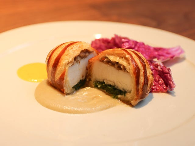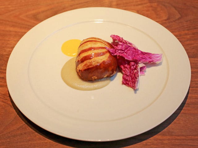 温かい前菜は「ほたてのパイ包み」(写真上)。こんがりサクサクのパイにナイフを入れると、フワッと海の香りが立ちのぼり、大ぶりのホタテ貝柱が現れる。バター風味が効いたパイ包みは、冬にこそ食べたい料理だ。