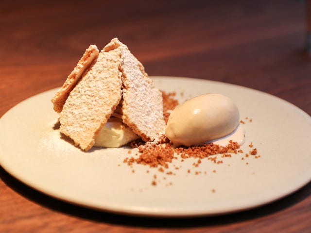 コース最後に登場したのは「モンブランとヘーゼルナッツのアイスクリーム」(写真上)。フロマージュ・ブランのムースにラム酒が効いた栗ペーストを合わせている。上から被さっているのは板状になったメレンゲ。