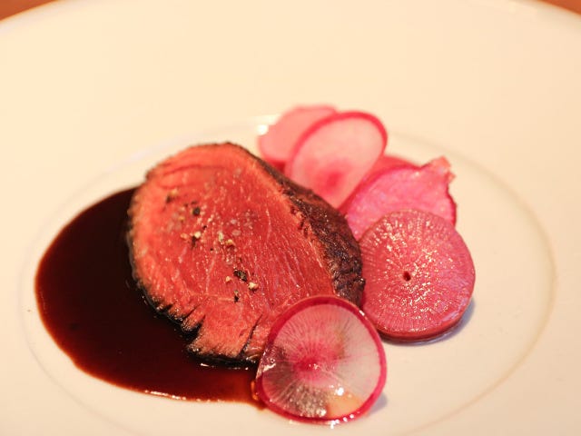 ソースは、鹿肉に合わせる伝統的なソース、ジュニパーベリーの赤ワインソース。バター等を控えめにし、鹿のだしでコクを出したソースは、軽やかでフルーティな酸味が淡泊な鹿肉の味わいをパッと華やかにしてくれる。