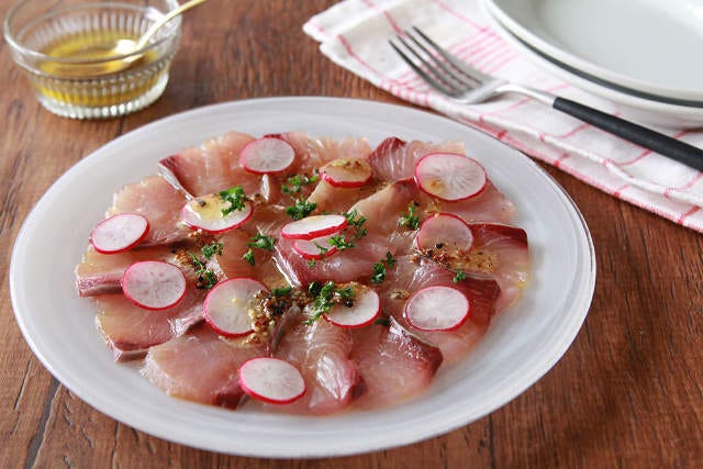 旬のブリは、キュッと締まった身と脂のノリの良さが特徴。旬ならではのおいしさをダイレクトに味わえる洋風アレンジが、ブリの刺身を使ったカルパッチョだ。
