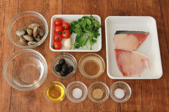 ② 厚手の鍋に水、ブリ、アサリ、黒オリーブ、ミニトマト、ニンニク、白ワインを入れて蓋をし、中火で熱する。沸騰したら弱火にし、5分煮てアサリの殻が開き、ブリに火が通ったら火を止める。