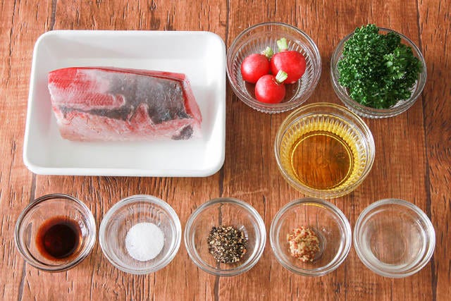 ① ラディッシュは薄切りにする。パセリはみじん切りにする。ブリは3~4mmの薄切りにしてバットに重ならないように並べる。