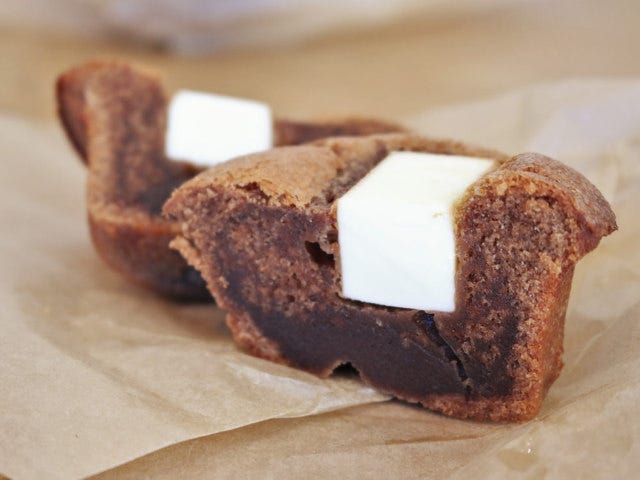 一口サイズの「オリジナル」味のブラウニーにピーカンナッツが乗った「ブラウニーバイト」(写真上・左)は、ちょっとしたギフトとして人気が高い。