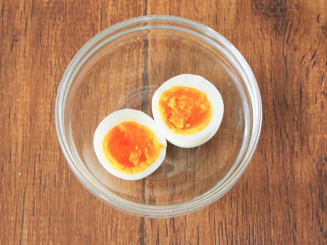 そこで重要となる卵の茹で具合は、「半熟」が鉄則。常温の卵を8分半茹でたらすぐに氷水で急冷することで、固まりすぎないちょうど良い加減の半熟卵になる。