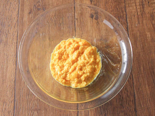 ② 小さめのフライパンにバターを入れて弱火で熱し、バターが溶けたら①を加えて、卵が固まってきたらヘラで大きく混ぜるのを繰り返す。ほぼ半熟の状態になったら火を止めて、ボウルに移しキッチンペーパーをのせて粗熱を取る。(キッチンペーパーをのせるのは乾燥を防ぐため。ラップだと蒸されて卵が硬くなってしまう可能性があるので、通気性の良いキッチンペーパー推奨)