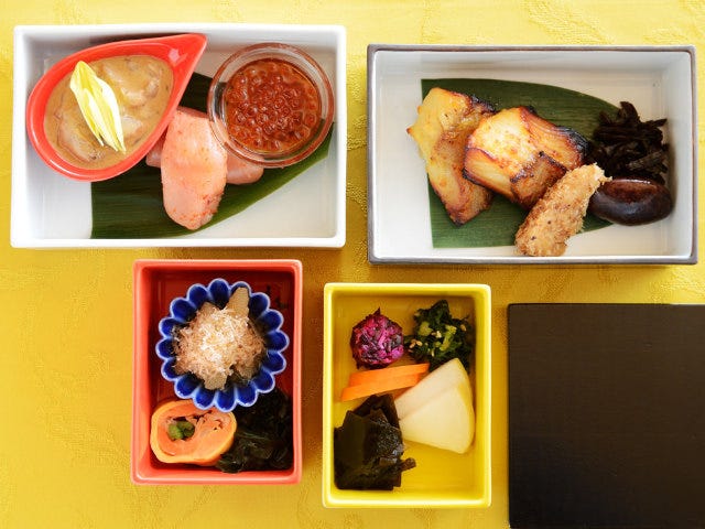 まず三段重を広げてみると、一段目は漬物の盛り合わせ(写真上・手前右)や野菜茶巾や玉こんにゃく、豚角煮など(同・手前左 ※この日は数の子)、二段目は銀ダラの味噌漬け焼き(同・右上)、三段目は、ごま醤油で味付けした鯛とオリジナルの辛子明太子、鮭、イクラが並ぶ(同・左上)。