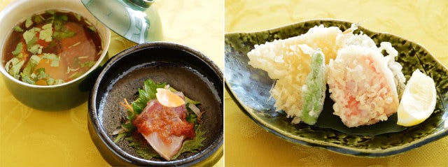 その他、膳を構成する「ブリの刺身と吸物(お澄まし、通常は白味噌仕立て)」(写真上・左)は竹岡醤油で調味した味わい深さが感じられる。「野菜のかき揚げ天麩羅」(同・右)はサクサクとした食感と素材の甘みが楽しめる一品だ。
