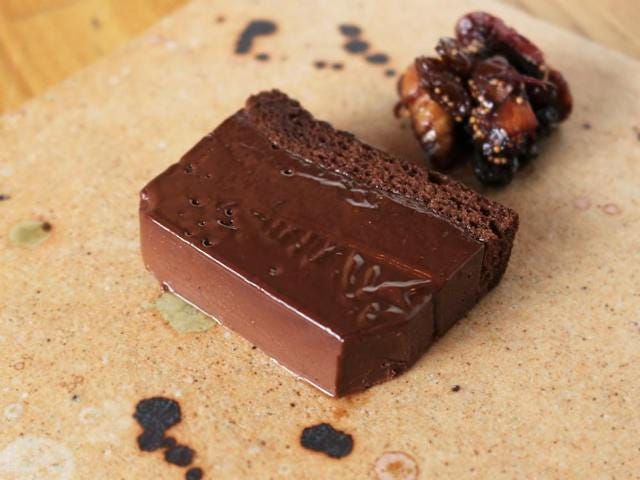 クローブ、ナツメグなど4種のスパイスを加えた「生チョコレート テリーヌ」(写真上)は、甘みを控えた大人のためのデザート。少し甘めのデザートワインとゆっくり味わいたい。