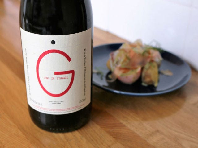 口当たりなめらかなブドウ品種・ガメイを100%使った、フランス産の自然派ワイン「ポワン・ジェ」(写真上)を。イチゴのような酸味と甘みが特徴だ。