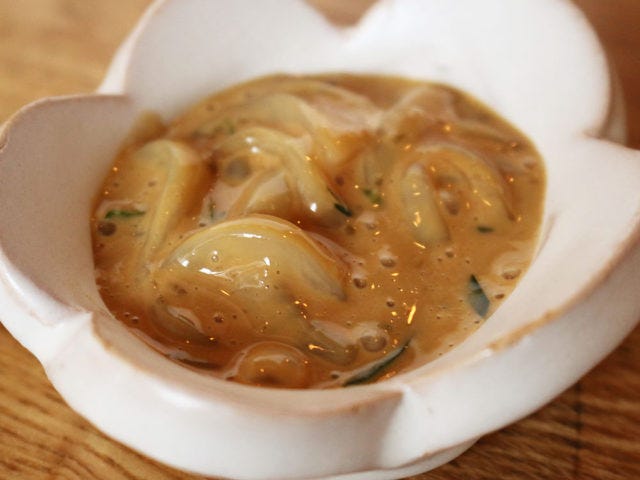 エスニック料理には欠かせない柑橘類のコブミカンの葉を細くきざんで、イカの塩辛に合わせている。濃厚なワタに潜むコブミカンは少量ながら存在感があり、スーッと爽やかな風味を放っている。まさに、何料理でもない『ketoku』らしい逸品だ。