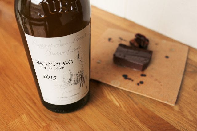 ブランデーを添加してさらに古樽で発酵させた、フランス・ジュラ地方のデザートワイン「マクヴァン・デュ・ジュラ」(写真上)は、果汁本来の甘みが、まさに甘露! チョコレートを含んだ口中にとろんと広がると、一日の疲れも溶けてなくなるようだ。