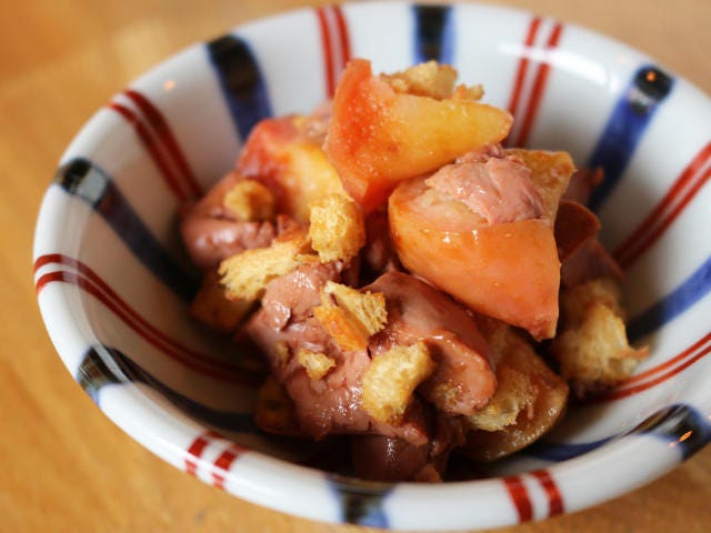 “つめたいメニュー”の人気の品、「鶏のレバーと焼きりんご、クルトン」(写真上)は、とろっとして臭みのないレバーと、ジューシーな焼きリンゴを和えたシンプルなひと皿。レバーとリンゴの出会いは衝撃的なほど相性がいい。リンゴ以外に、イチヂクや柿を使うこともある。