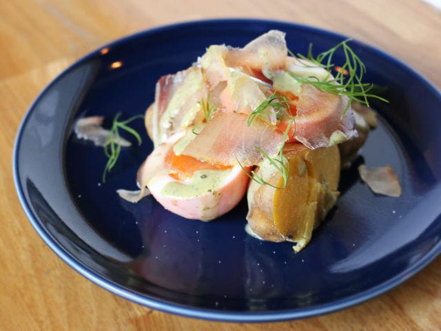 梅味をまとった半熟卵、ほっくりしたジャガイモ、燻製香がほどよく効いた鯖の生ハムのハーモニーには、軽めの赤ワインはいかがだろう。